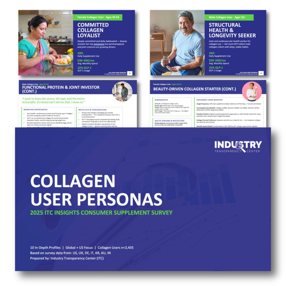 Each persona represents a distinct collagen consumer archetype derived from the 2025 ITC Insights Consumer Supplement Survey — Collagen Users edition. This dataset captures 2,435 confirmed collagen users ages 18+ across 7 countries (US, UK, Germany, Italy, South Korea, Australia, India), fielded June 2025.
