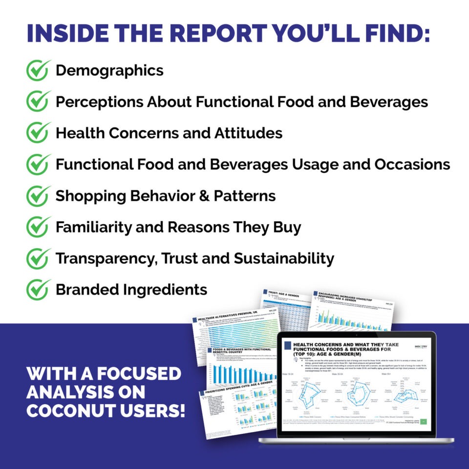 This report analyzes coconut consumer behavior in the functional food and beverage market, based on survey data collected December 2024 – January 2025 from over 2,000 consumers (1,001 US, 1,002 UK) by the Industry Transparency Center. Coconut consumers made up 703 consumers in the US (70%) and 734 in the UK (73%).